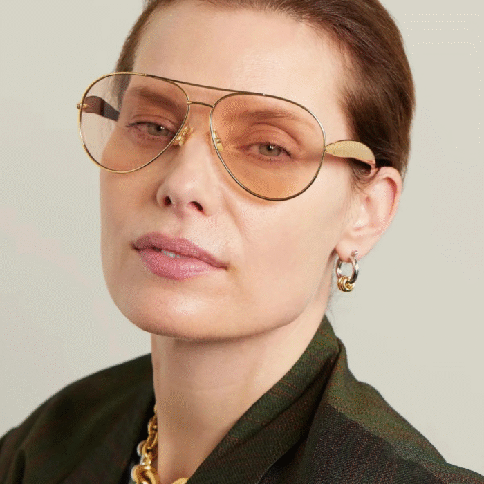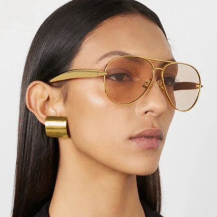 The Bottega Veneta BV1305S 002 sunglasses are meticulously crafted with a shiny gold metal frame, a detail that exudes opulence and refinement. This full-metal construction ensures both durability and a lightweight feel, allowing for comfortable wear throughout the day. The frame’s pilot shape is a classic and flattering choice, offering a wide fit that complements a variety of face shapes. A subtle yet distinct detail is the minimalist metal top bar, which is engraved with the iconic Bottega Veneta logo, serving as a hallmark of the brand’s understated luxury.
