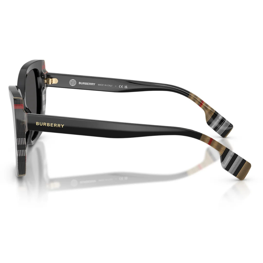 The architecture of the Burberry BE4393 is defined by its Statuesque Cat Eye Silhouette. The design utilizes chiseled geometric volumes and up-swept edges to create a balanced three-dimensional profile that provides immediate definition to the facial structure. A key technical highlight is the sculpted temple construction, where the Burberry lettering is integrated into the material, serving as both a structural anchor and a hallmark of sophisticated branding. With a 54 mm lens and a 17 mm bridge, the frame provides a calculated fit for all-day ergonomic stability.
