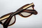 Havana 10mm cured cellulose acetate frame with custom double laminated acetate temples featuring precious metal hardware and blue lenses