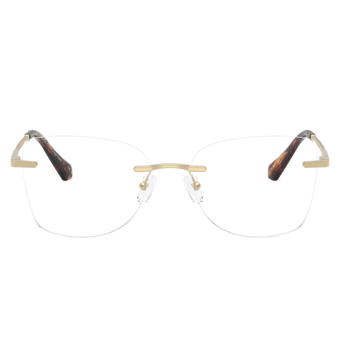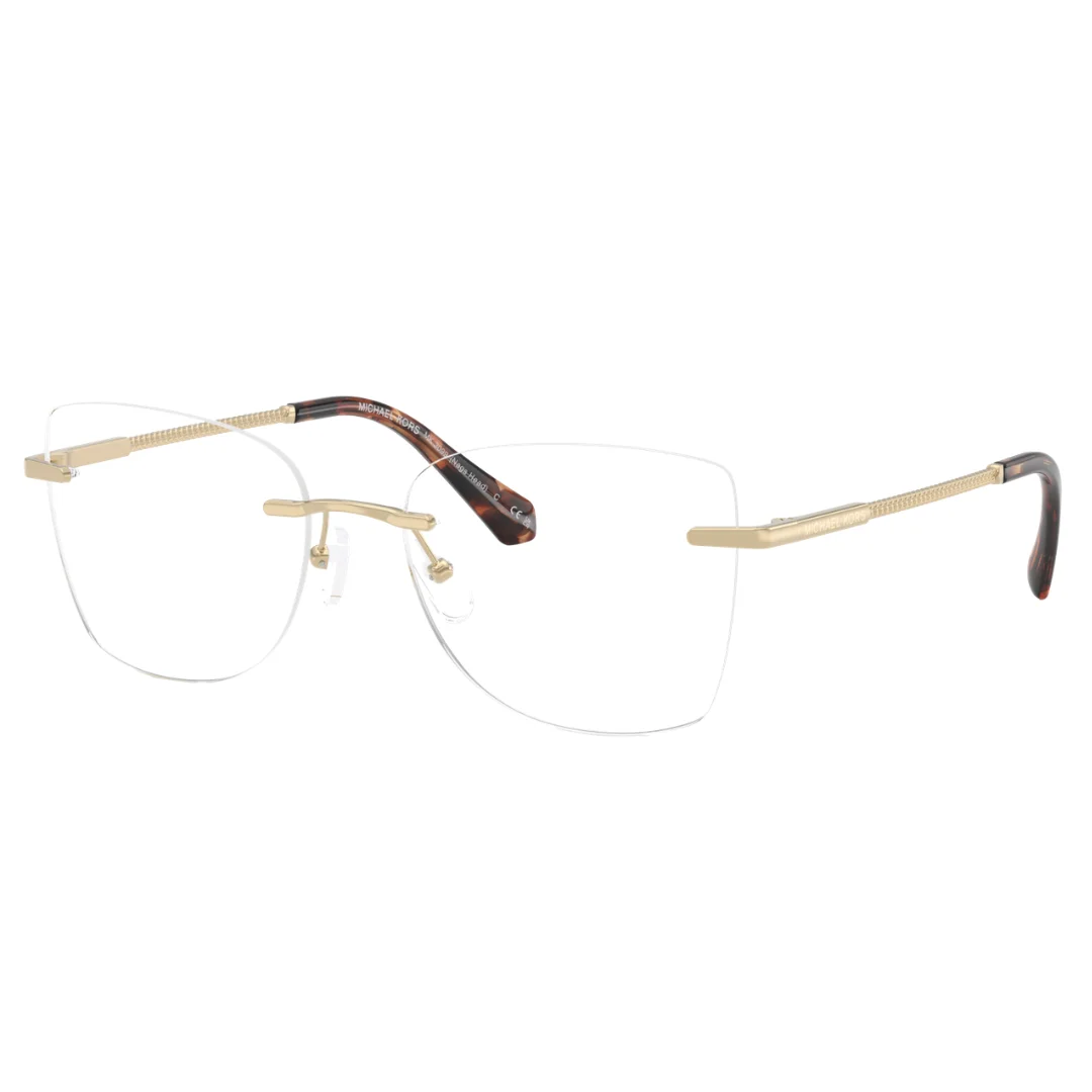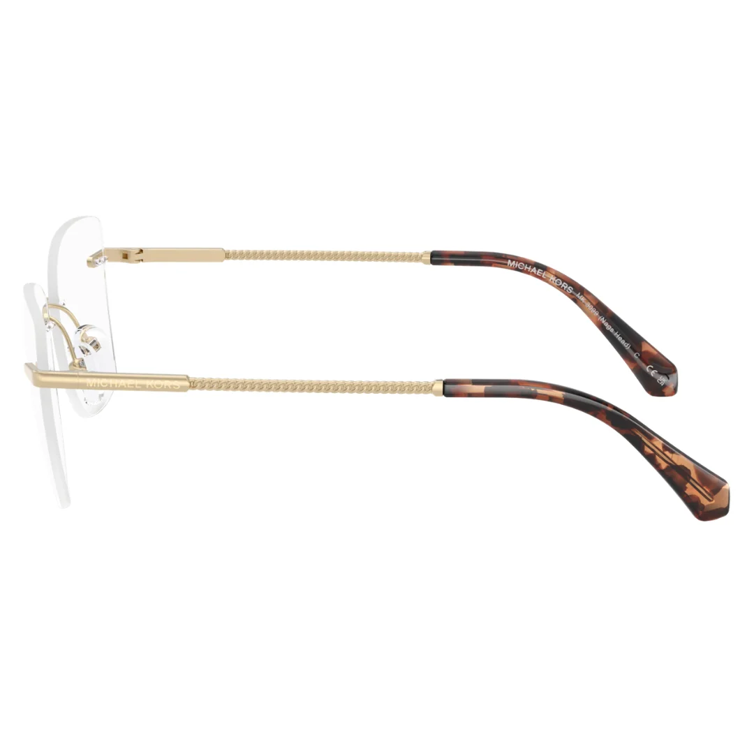 The Michael Kors MK3099 1014 (Snack’s Head) is a masterclass in contemporary luxury, where sharp architectural lines meet modern technical sculpting. Expertly crafted in Italy, this frame is machined from premium Light Gold metal, featuring a rimless three-piece construction that offers a weightless, “barely-there” aesthetic. This purposeful design serves as a seamless foundation for high-performance optical prescriptions, arriving with clear demo lenses.