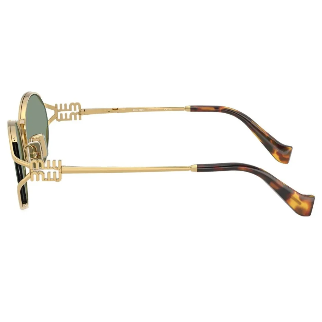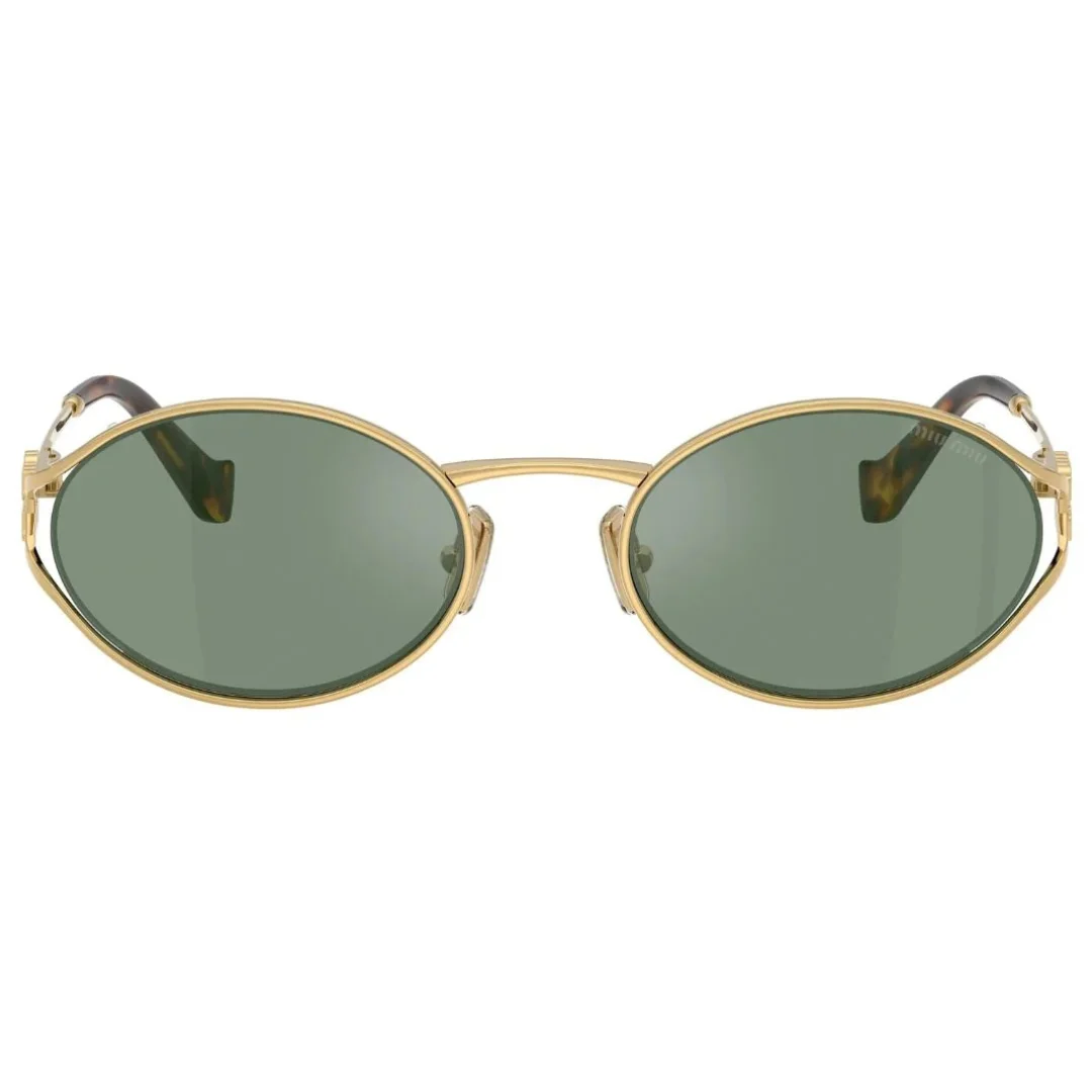 The Miu Miu SMU 52Y 5AK 04M (also known as the 0MU 52YS) is a centerpiece of the House’s daring and provocative design language. This model redefines the classic oval silhouette with a distinctive, high-fashion twist. The Gold metal frame is paired with Green bio-polyamide lenses that feature an internal silver mirror coating, providing a sophisticated depth and a unique visual signature while ensuring Category 2 sun protection.
