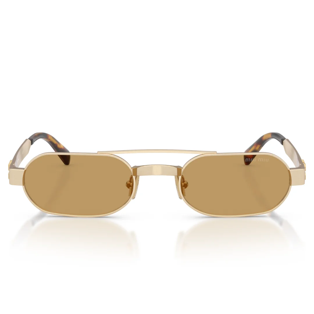 The architecture of this eyewear is defined by its Geometric Navigator Silhouette. The design features a bold, double-bridge aesthetic with a thin upper bar that beautifully contrasts with a wider, structured nose bridge, providing a distinct retro-modern feel. The straight metal temples are a key focal point, seamlessly integrating the iconic vertical Miu Miu Logo into the hinge area as a sculptural hallmark of luxury. With a 52 mm lens and a 21 mm bridge, it offers a refined yet impactful fit on the face.