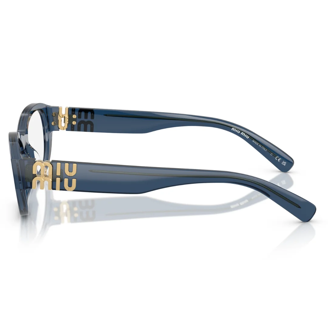 The architecture of this eyewear is defined by its Irregular Silhouette. This avant-garde shape features sharp, geometric lines and a multi-faceted front that adds a 3D sculptural quality to the face. The design is balanced by thick, substantial temples that prominently display the vertical Miu Miu Logo in a polished finish. With a 53 mm lens and a 19 mm bridge, it offers a Universal Fit that provides structural definition and a contemporary, high-fashion look.