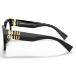 The architecture of this eyewear is defined by its Structured Square Silhouette. The design features sharp, beveled edges and substantial frame volumes that provide immediate structural definition, making it an excellent choice for balancing softer facial contours. The temples serve as a major design focal point, prominently displaying the vertical Miu Miu Logo integrated into the hinge area in a polished finish, marking it as a hallmark of luxury.