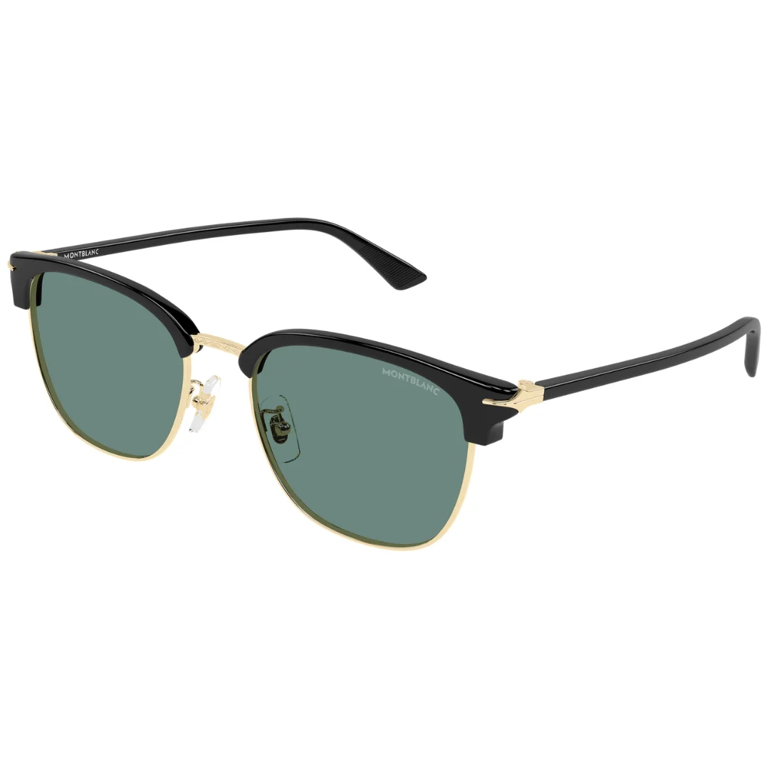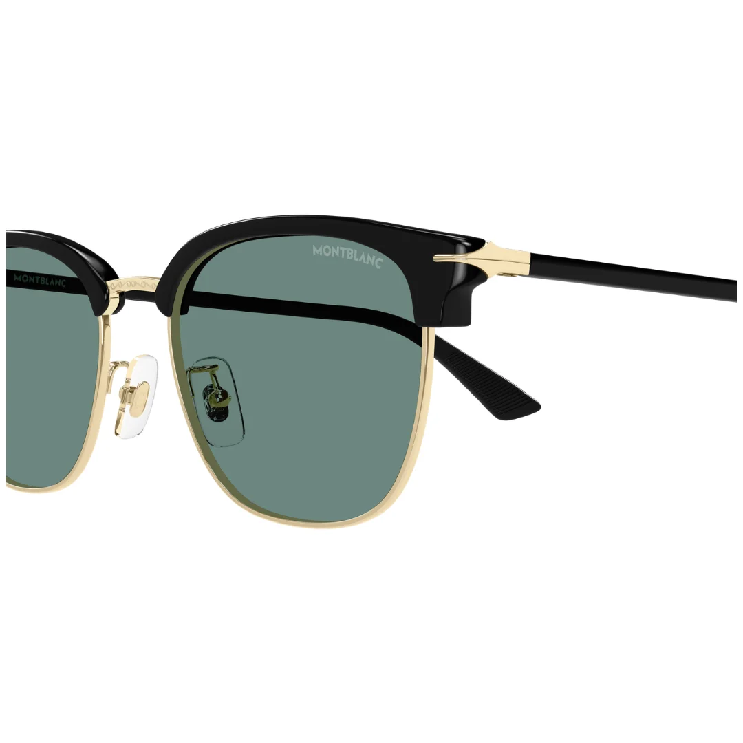 The Montblanc MB0439SA 002 sunglasses showcase a sharp and commanding square shape, a confident silhouette that frames the face with authority. The construction features a luxurious combination of materials: the frame front is crafted from premium metal in a rich gold color, providing a classic, upscale base. This is boldly contrasted by the black acetate eyebrows and matching black temples, which add structure, depth, and a modern, cohesive finish to the design. This elegant combination of gold, black, and acetate defines the distinct look of the Montblanc MB0439SA 002.
