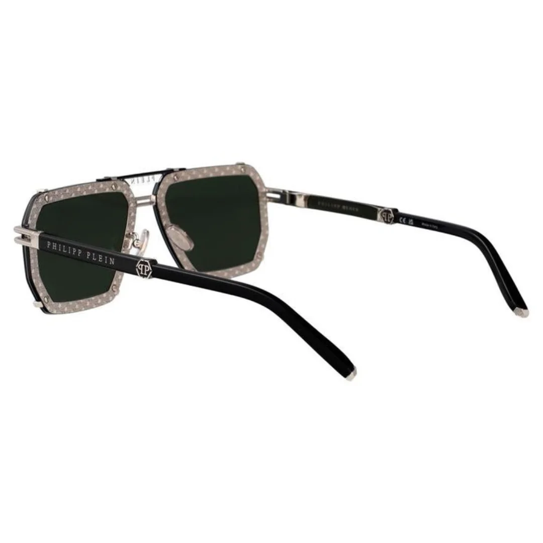 The design of the Philipp Plein SPP131 583X sunglasses is anchored by a massive 64 mm lens size set within a classic Navigator shape. This silhouette provides maximum coverage and an authoritative profile. The frame is constructed from high-grade, polished Silver metal, giving it a sleek, industrial brilliance that catches the light from every angle. Look closely and you will find the signature Philipp Plein “Hexagon” logo and intricate detailing on the temples and bridge, signaling the brand’s obsession with detail and prestige. The 145 mm temples ensure the frames stay balanced and secure, despite their substantial, oversized aesthetic.