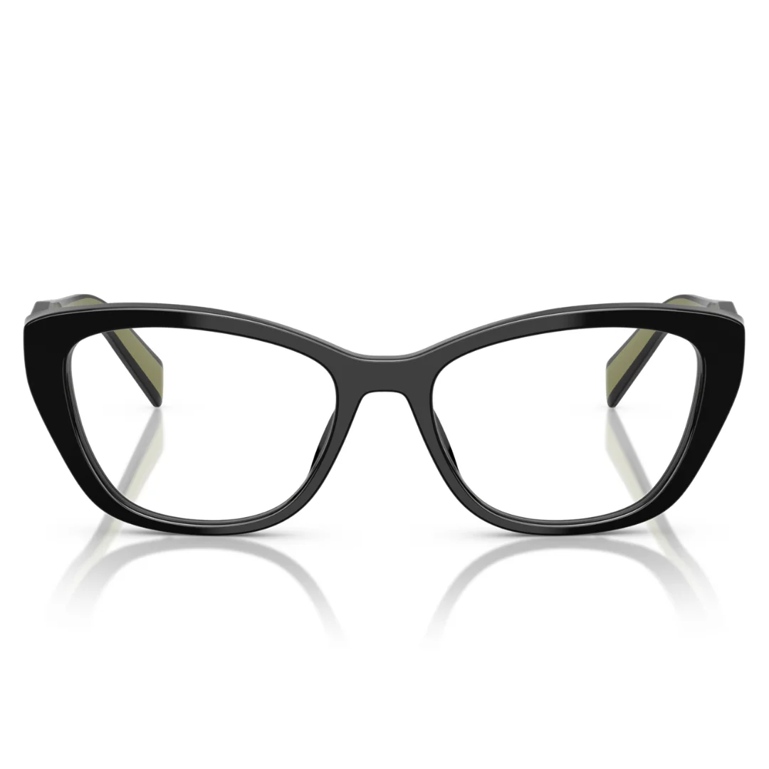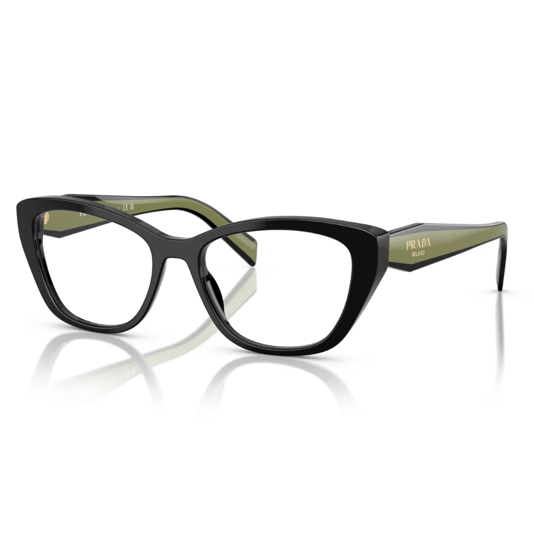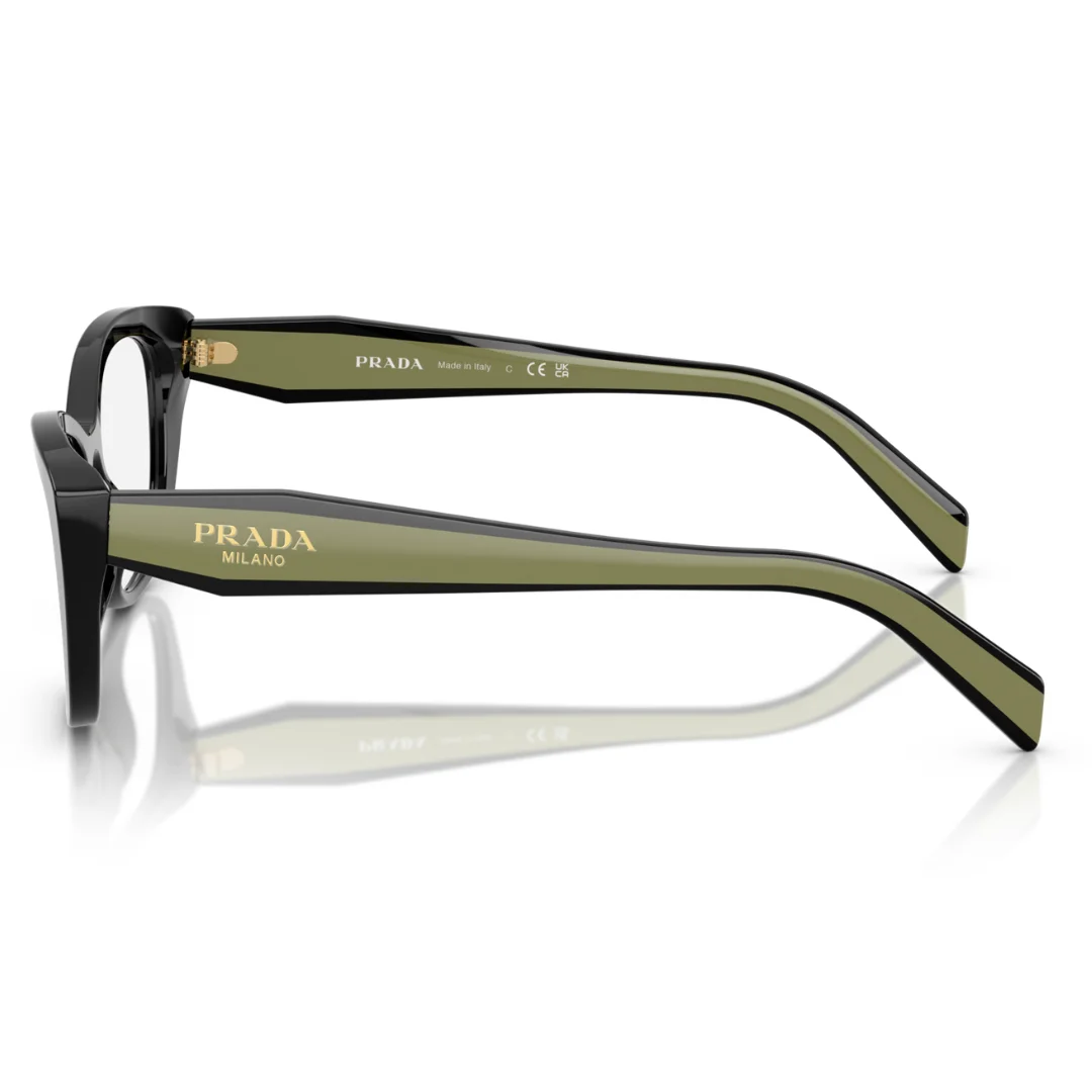The architecture of the Prada 0PR 19W 03K 1O1 is defined by its Statuesque Cat Eye Silhouette. The design features sharp, faceted surfaces and substantial volumes that provide immediate structural definition, lifting the face with its modern, geometric take on a classic shape. The standout design element is the earth-toned contrast, where the black front is masterfully paired with striking Olive temples. These thick temples prominently display the iconic Prada Milano Logo lettering as a hallmark of elite artistry. With a 53 mm lens and a 17 mm bridge, it offers a Commanding fit that balances a bold presence with all-day wearability.