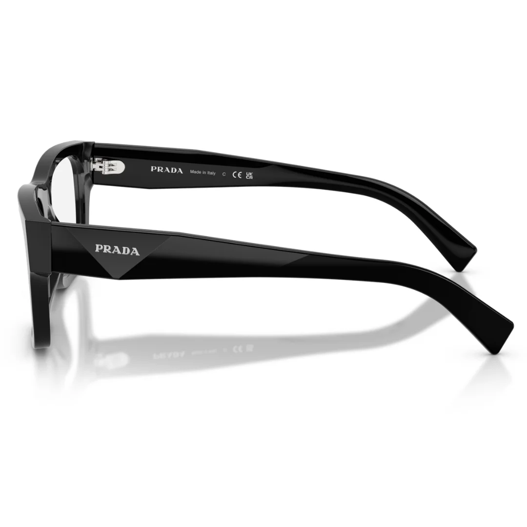 The profile of the Prada 0PR C01 16K 1O1 is defined by its Statuesque Square Silhouette. The design utilizes chiseled, multi-faceted surfaces that create a dynamic interplay of light, giving the solid black material a dimensional and expressive quality. The temples are a primary structural narrative of the frame, featuring a bold, wide geometry that tapers into an ergonomic fit, finished with the iconic Prada Milano Logo plaque. With a 54 mm lens and a wide 20 mm bridge, it offers a commanding presence with a balanced weight distribution.