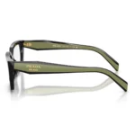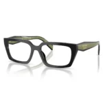The architecture of the Prada 0PR D05 03K 1O1 is defined by its Structured Rectangular Silhouette. The design features sharp, beveled edges and substantial volumes that provide immediate structural definition to the face. The standout design element is the earth-toned contrast, where the black front is masterfully paired with striking Olive temples. These thick temples prominently display the iconic Prada Milano Logo lettering as a hallmark of elite craftsmanship. With a 55 mm lens and a 17 mm bridge, it offers a refined fit that balances a bold presence with all-day wearability.
