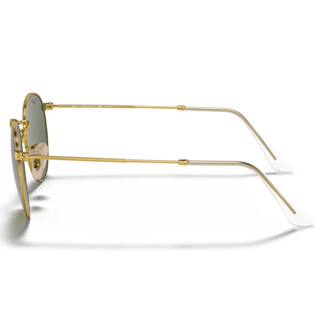 The Ray Ban 0RB3447 00158 frame boasts a sophisticated polished gold metal front, providing a lightweight yet durable structure. The sleek design is complemented by thin metal temples with plastic end tips that rest comfortably behind the ears, ensuring a comfortable, secure fit. The 50mm lens size offers an optimal fit and coverage, while the adjustable nose pads provide a bespoke feel for all face shapes.