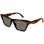 The Saint Laurent SL M103 001 sunglasses showcase a distinct and universally flattering cat-eye shape, a powerful silhouette that exudes sophistication and allure. The frame is meticulously crafted from high-quality acetate in a Spotted Havana finish. This versatile brown havana acetate provides a sharp, sophisticated aesthetic that seamlessly complements any wardrobe, from high-fashion ensembles to smart casual attire. This ensures the Saint Laurent SL M103 001 stands out with enduring brilliance, perfectly fitting into Mumbai’s diverse style landscape. Paired with this stunning frame are high-performance grey Solid lenses.