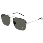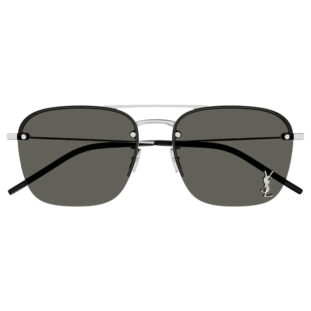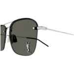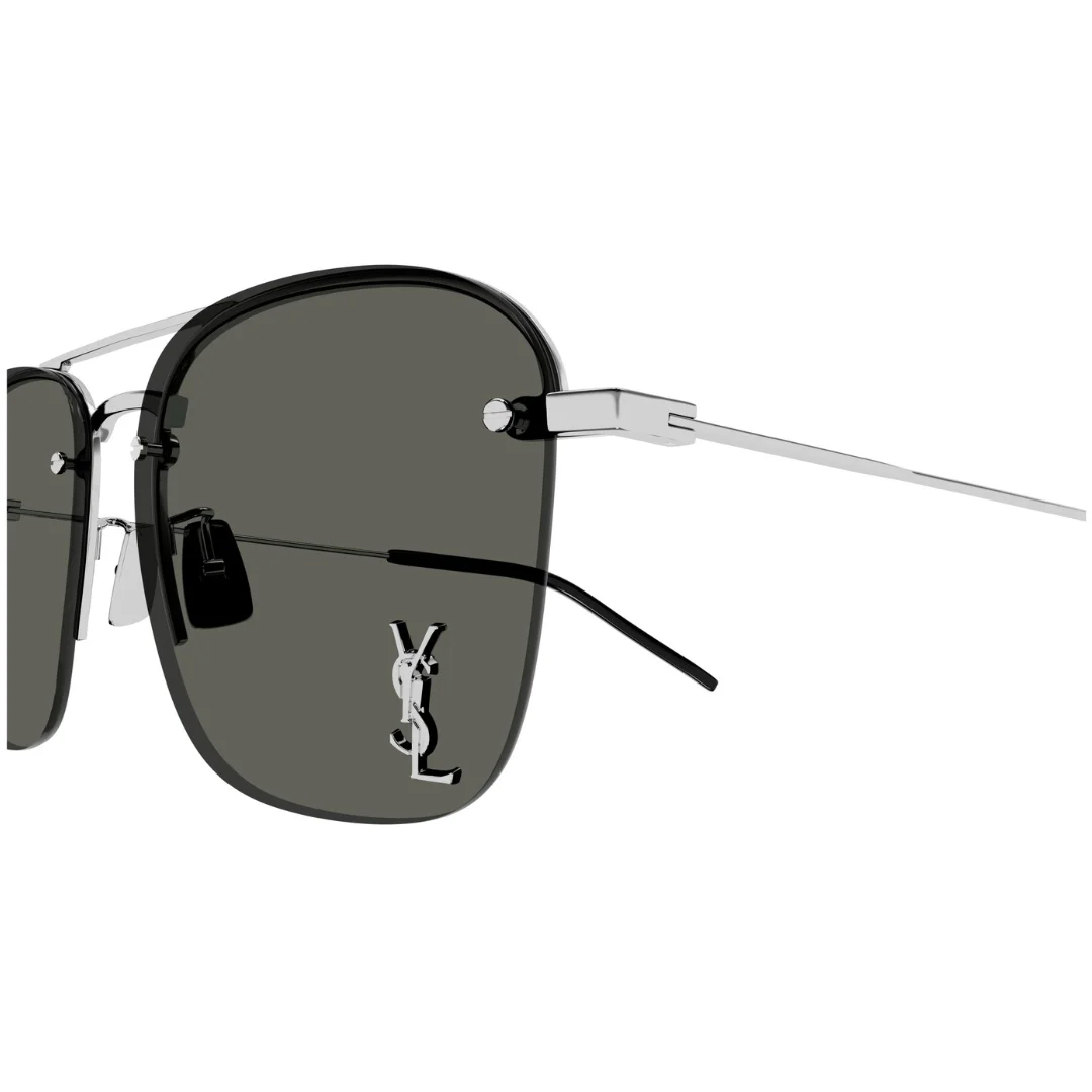 A key highlight of the Saint Laurent SL309M 006 is the masterful contrast between the delicate frame and the bold YSL logo. The iconic YSL pin is subtly but definitively positioned on the lens, creating a striking focal point and a clear mark of luxury branding. This innovative placement is a signature element of the design. The style is completed with high-performance solid grey lenses. These refined lenses offer exceptional sun protection, providing a neutral, true-to-life view of the world while ensuring maximum glare reduction and visual clarity. The solid grey tint ensures consistent protection across the entire lens surface.