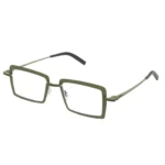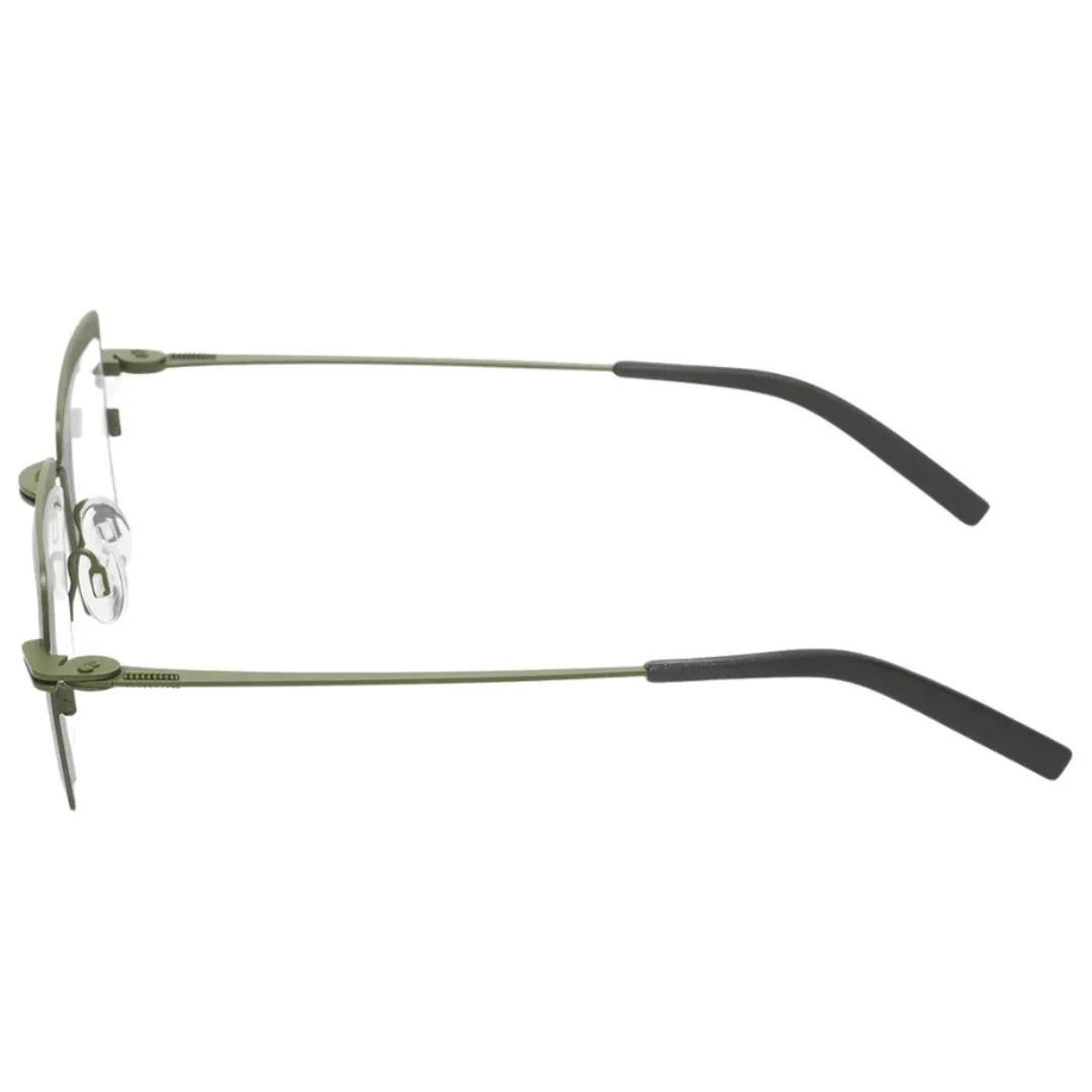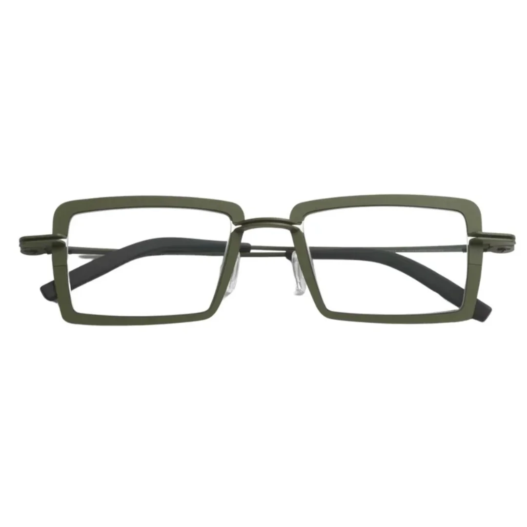 The Theo Ribbel 184 is defined by its compact Geometric Square shape. With a 48 mm lens size, it offers a perfectly proportioned look for those who appreciate architectural lines over oversized trends. The frame is rendered in a sophisticated Olive Green, a signature Theo hue that is both earthy and avant-garde. This matte olive green frame is crafted from high-quality stainless steel, ensuring the glasses are incredibly durable and flexible while remaining exceptionally lightweight on the face.