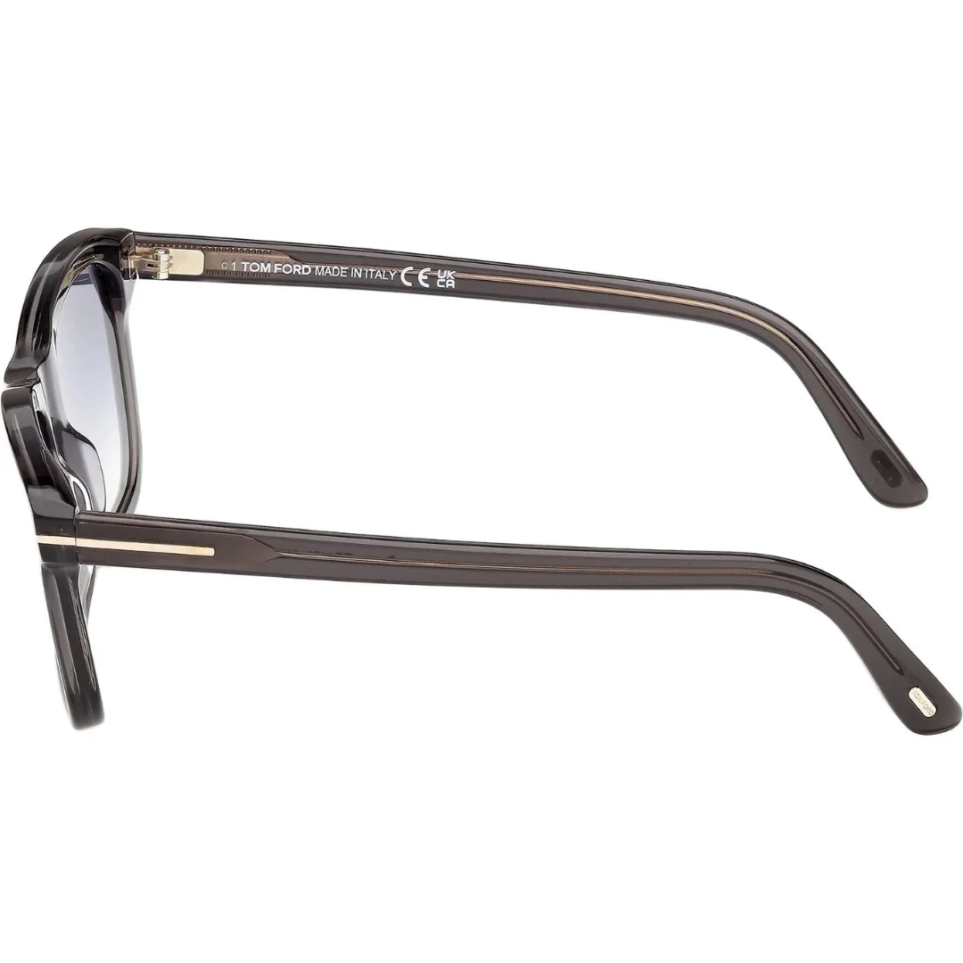 The visual impact of the sunglasses begins with its sophisticated grey colour palette. The frame is crafted from a unique, transparent shiny grey colour acetate that offers a subtle, smoky translucence. This finish is less aggressive than solid black, providing a high-fashion edge that complements a vast array of skin tones and apparel. As versatile unisex sunglasses, the frame features a bold square shape with beveled corners, lending a structured yet fluid aesthetic to the face. The iconic gold-tone “T” logo is meticulously inlaid at the temples, serving as the unmistakable signature of Tom Ford’s global prestige.