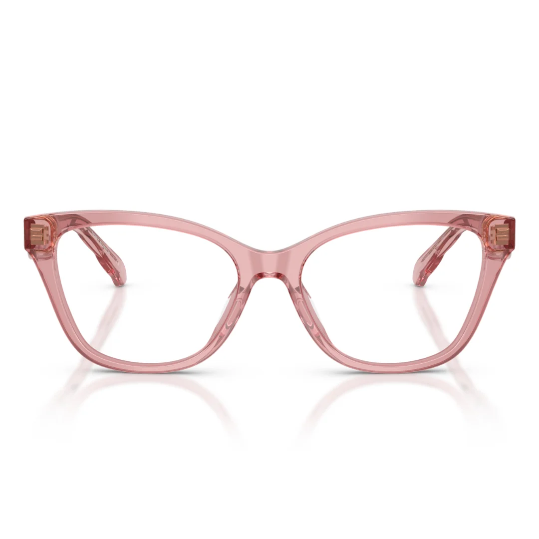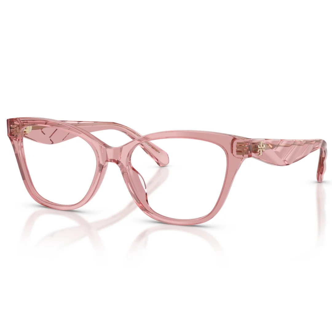 The architecture is defined by its Statuesque Cat Eye Silhouette, utilizing chiseled geometric temples to create a balanced three-dimensional profile. A key technical highlight is the Chevron quilting detail on the temples—a signature texture inspired by Tory Burch’s luxury leather goods—which is seamlessly integrated into the Transparent Pink acetate. With a 51 mm lens and a Universal Fit bridge, the frame ensures calculated all-day ergonomic stability and a refined, airy aesthetic.