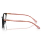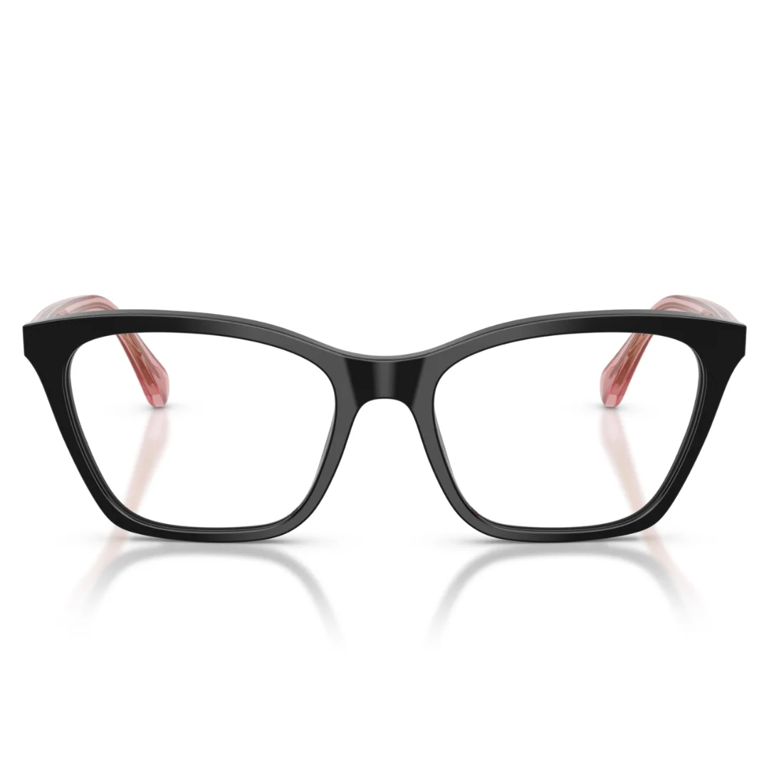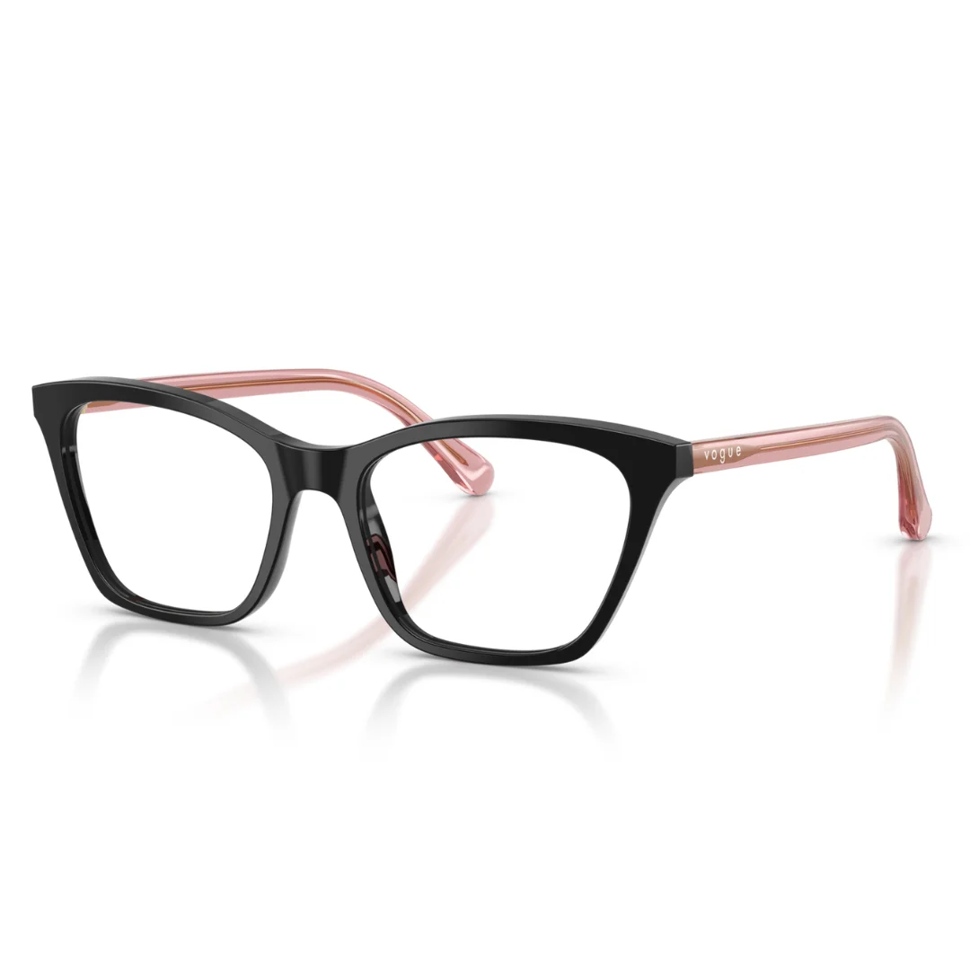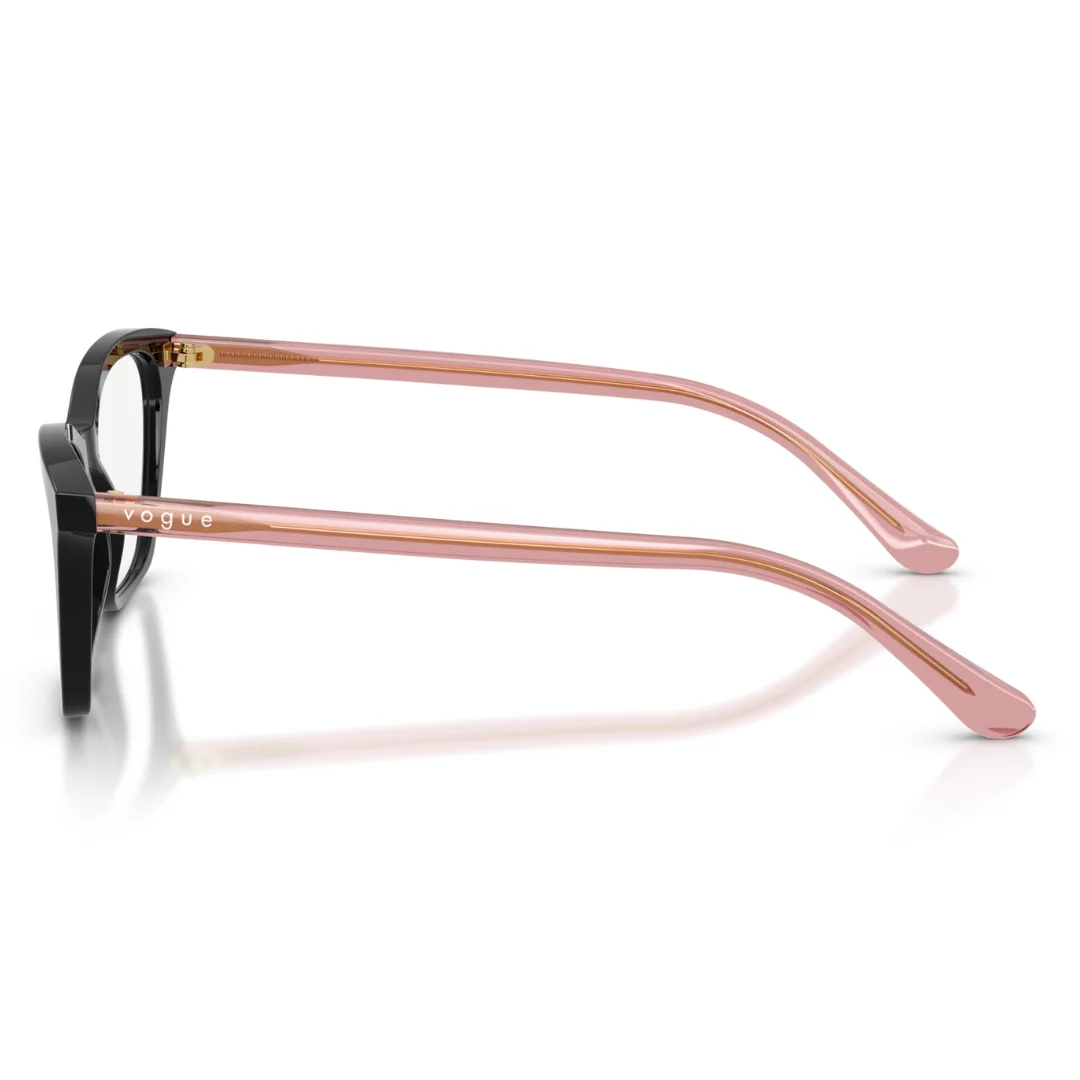 The Vogue 0VO5662I W44 eyeglasses showcase a distinct and alluring butterfly shape, a flattering silhouette that provides wide coverage and a vintage-glamorous uplift. The frame front is meticulously crafted from durable acetate in a sleek, classic black color. This bold black front ensures a commanding presence. The compelling contrast comes from the temples, which are crafted from transparent pink acetate. This unexpected splash of delicate, luminous pink against the strong black front ensures the Vogue 0VO5662I W44 stands out with visual interest, offering a chic, contemporary twist on a classic shape.