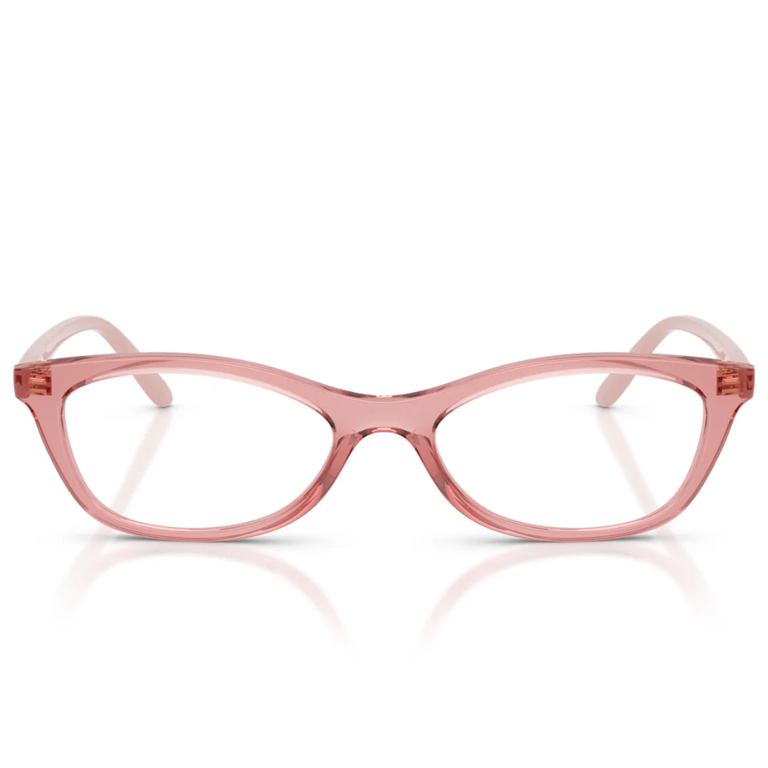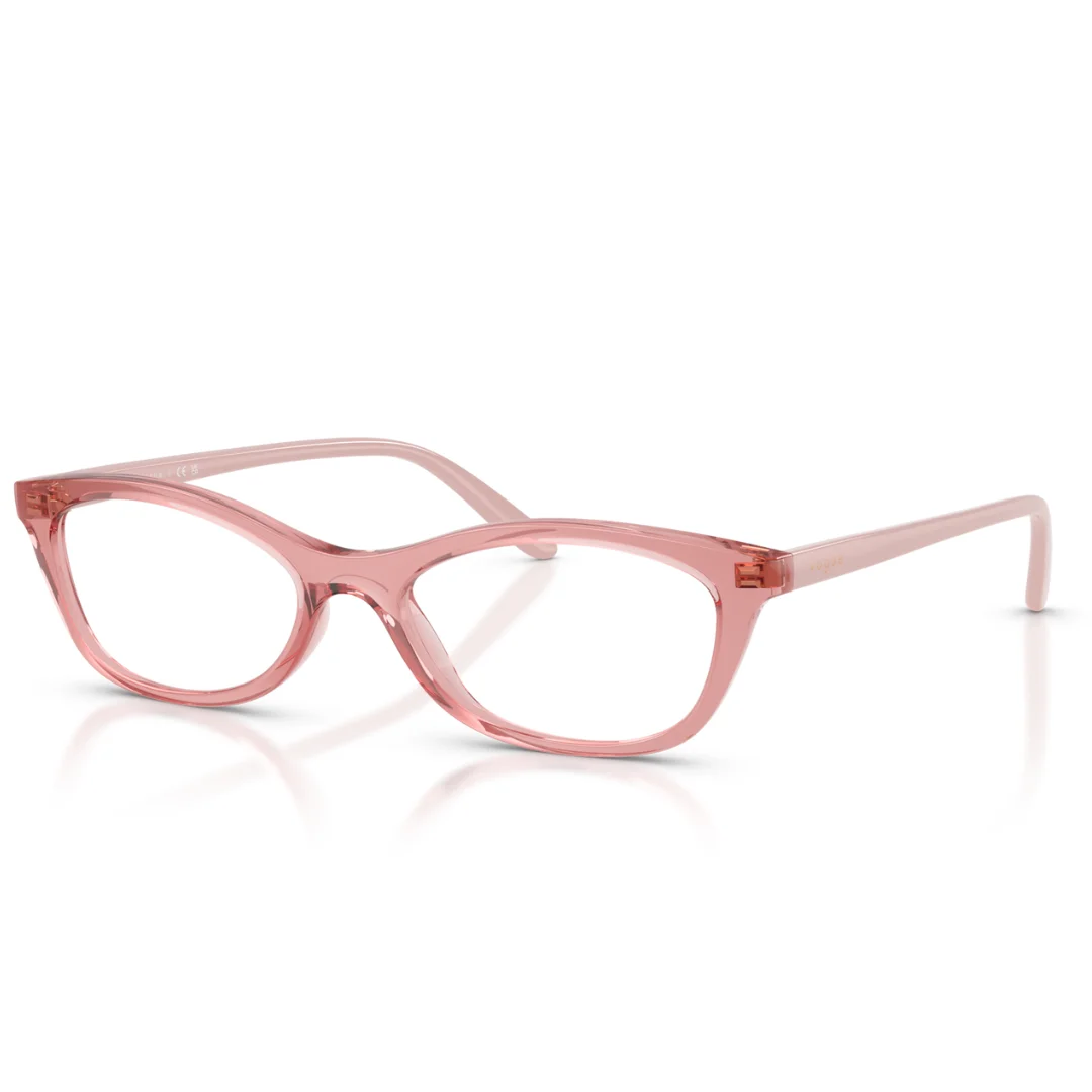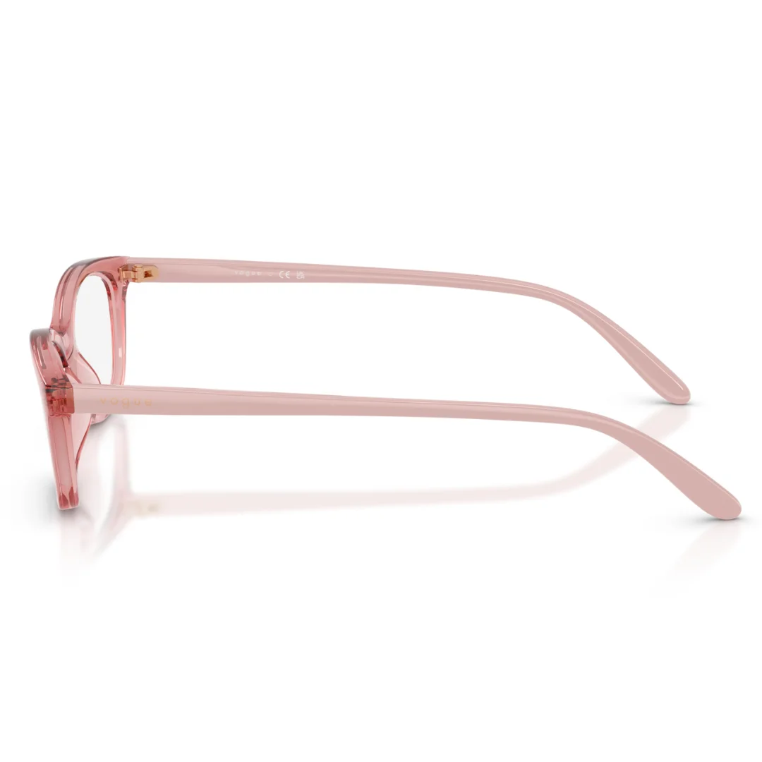The Vogue 0VO5668 2748 eyeglasses showcase a distinct and alluring cat-eye shape, a classic silhouette that instantly lifts and flatters facial features. The frame is meticulously crafted from durable acetate in a transparent pink color. This unique, crystal-clear pink hue offers a delicate and modern aesthetic, ensuring the Vogue 0VO5668 2748 stands out with luminous brilliance. The transparent nature allows light to pass through, creating an airy, light-weight look that is effortlessly chic and beautifully complements diverse skin tones. The gentle uplift of the cat-eye shape adds a touch of retro glamour and contemporary sharpness.